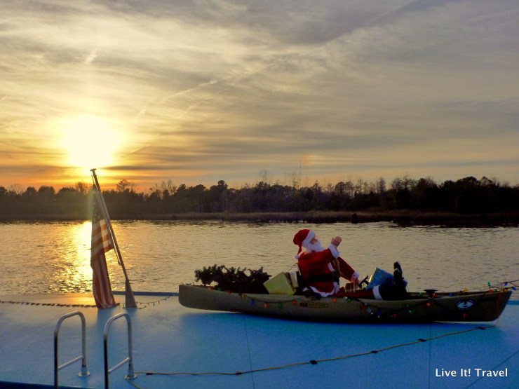 Near Manasquan, NJ – Went for a boat ride with some friends on the Manasquan River and was able to get a few nice shots of the sun going down. Of course, the engine died and we had to be towed.Santa-set, Wilmington, NC. Santa, Old Glory, water, sunset. What more can you ask for?